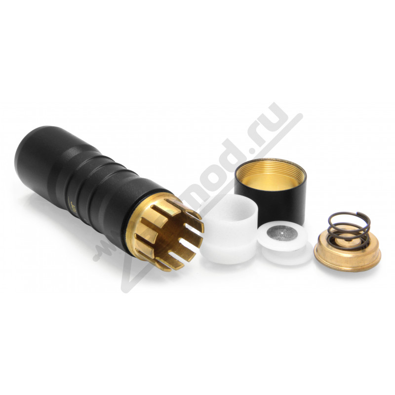 Вся контактная группа выполнена из латуни, а за автоматическую подстройку под высоту аккумулятора отвечает та же пружина, что и возвращает кнопку в исходное положение. При этом ни крышка мода ни пружина в токопередаче не участвуют, и ток задействует всего 2 детали – центральный контакт и тело кнопки. За вывод газов отвечает большое отверстие в нажимном механизме..
